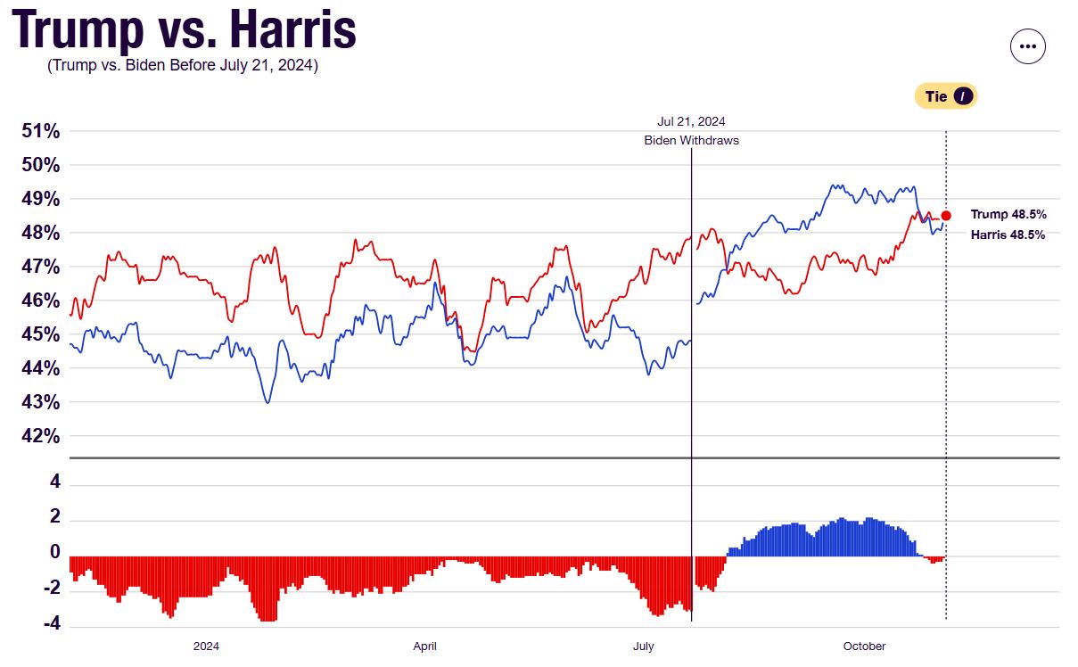 Aquí hay una pequeña preferencia por Harris, pues la demócrata tiene el 48.6% de la intención del voto, mientras que Trump sólo acumula un 48.2%.