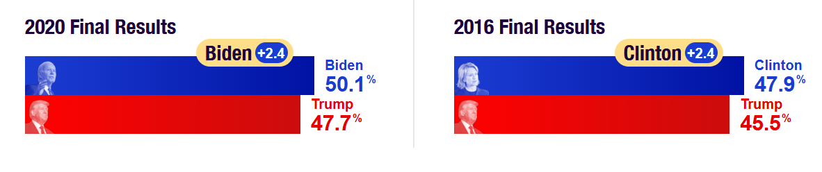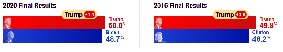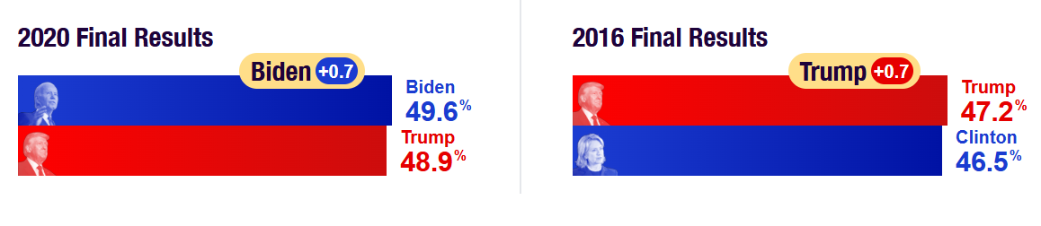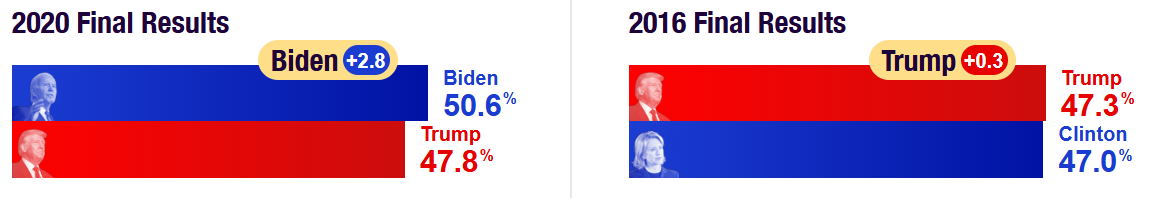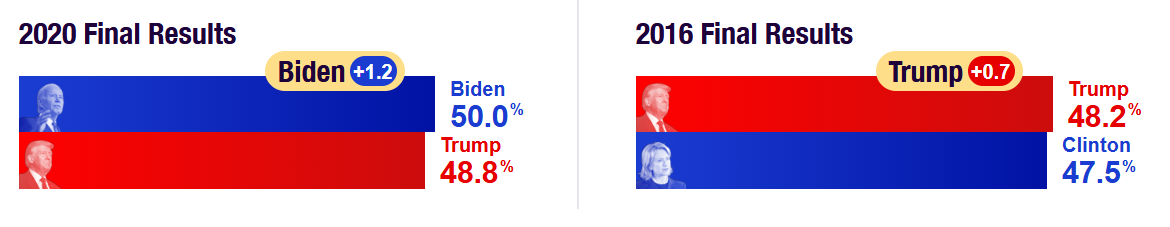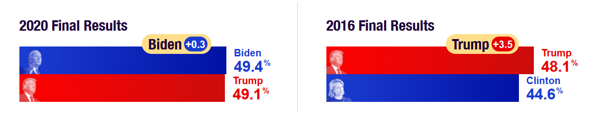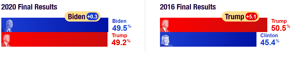 En las elecciones de 2020 Biden ganó por una diferencia muy pequeña, mientras que en 2016 Trump se llevó la victoria con más de 3 puntos de diferencia.