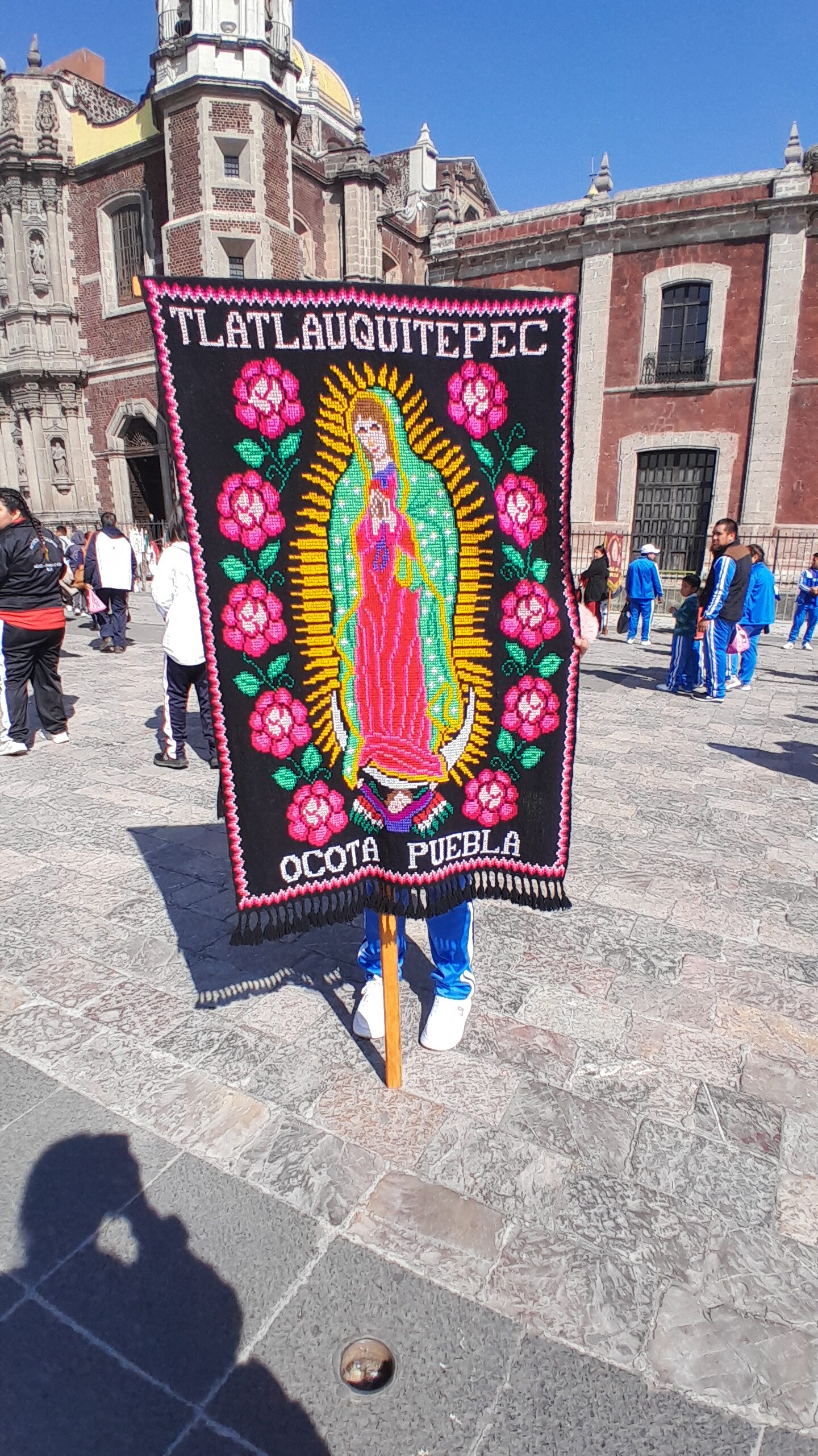 Otros peregrinos llevan estandartes, como esta joven que llegó desde Puebla ayer. Muchos llegan hoy, se despiden de la Virgen el 12 de diciembre y regresan a sus hogares.