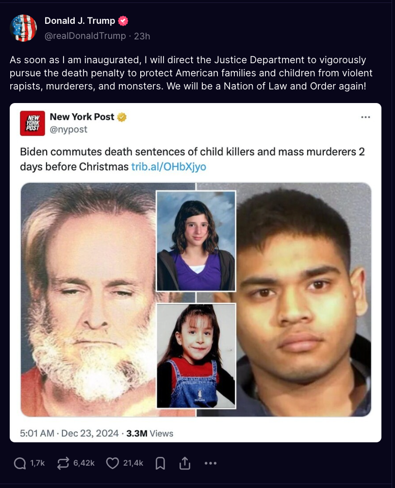 A través de su cuenta en la red social Truth Social, el presidente electo criticó la decisión de Joe Biden, quien conmutó la sentencia de 37 de los 40 presos que esperaban la ejecución federal, reemplazándola por cadena perpetua sin posibilidad de libertad condicional.