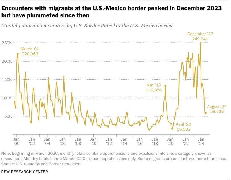 De acuerdo con el Pew Research Center, durante el año fiscal 2024 el número de encuentros con migrantes en la frontera entre Estados Unidos y México disminuyó drásticamente en 2024.