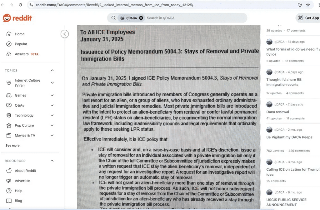 En redes sociales circuló el rumor de que Donald Trump eliminó las protecciones de la visa U, T y VAWA, esto es falso, sin embargo, sí modificó las reglas sobre cómo el Servicio de Inmigración y Control de Aduanas (ICE) maneja los casos de personas con solicitudes pendientes; un usuario en Redditt publicó que un periodista recibió el memorándum filtrado.