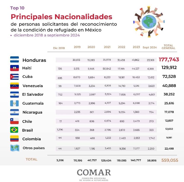 En total, entre 2018 y 2024, 559,055 personas de diferentes países han solicitado asilo en México.