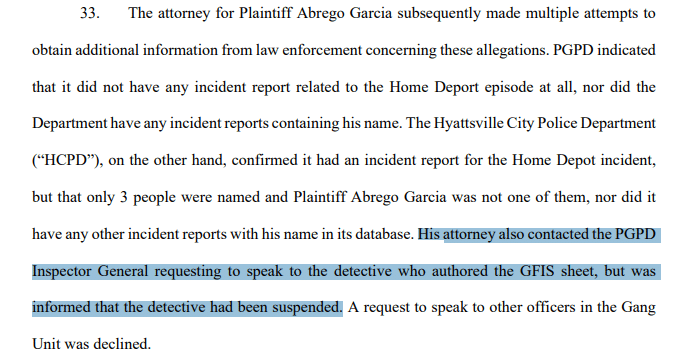 Además, Reichlin-Melnick agregó que, en 2019 los abogados de Abrego García buscaron al detective que hizo reporte con el reclamo de informante confidencial que relaciona al salvadoreño con la MS-13, sin embargo, no pudieron hacerlo porque el detective había sido suspendido de su trabajo.