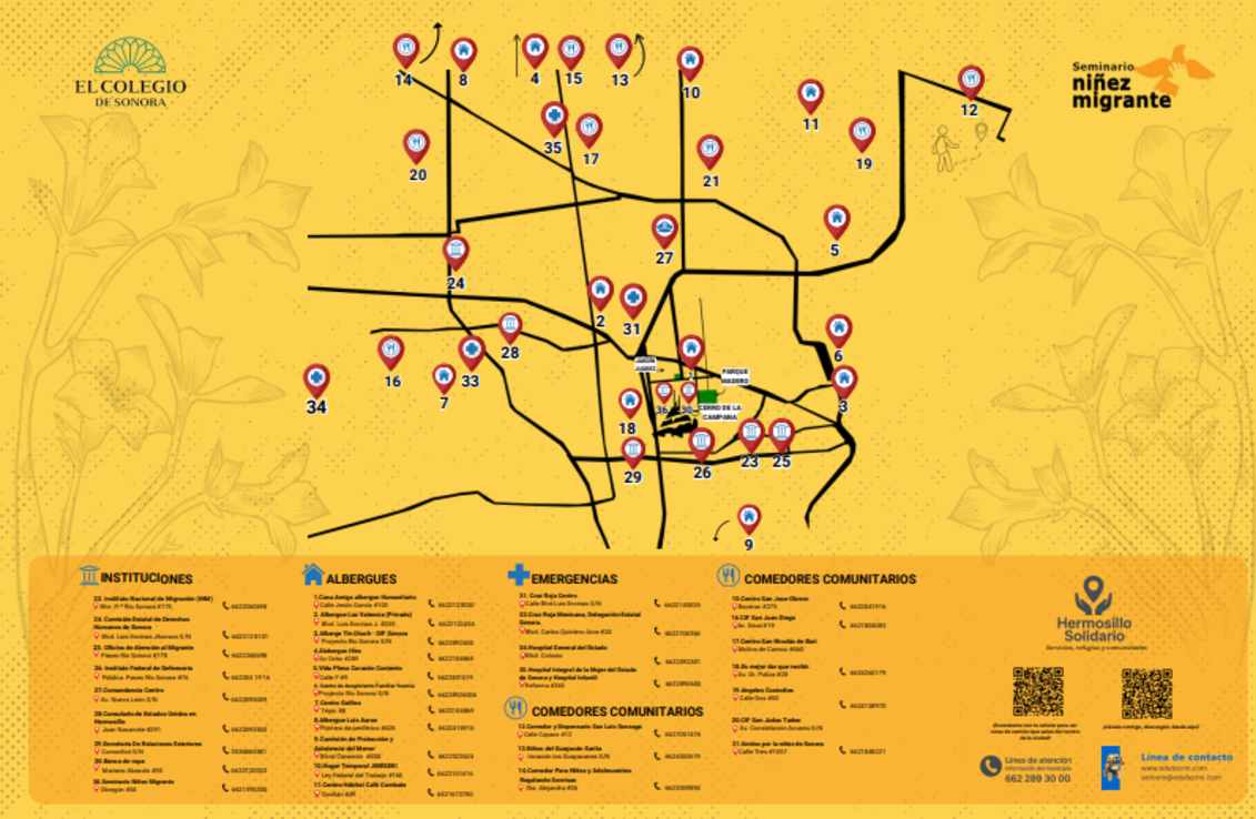 Los integrantes del Seminario Niñez Migrante (SNM) de El Colegio de Sonora presentaron el Mapa Hermosillo Solidario, con el objetivo de fortalecer las redes de solidaridad local, visibilizar los servicios de asistencia disponibles y promover el ejercicio del derecho a la protección para las personas en tránsito o en contextos de vulnerabilidad.