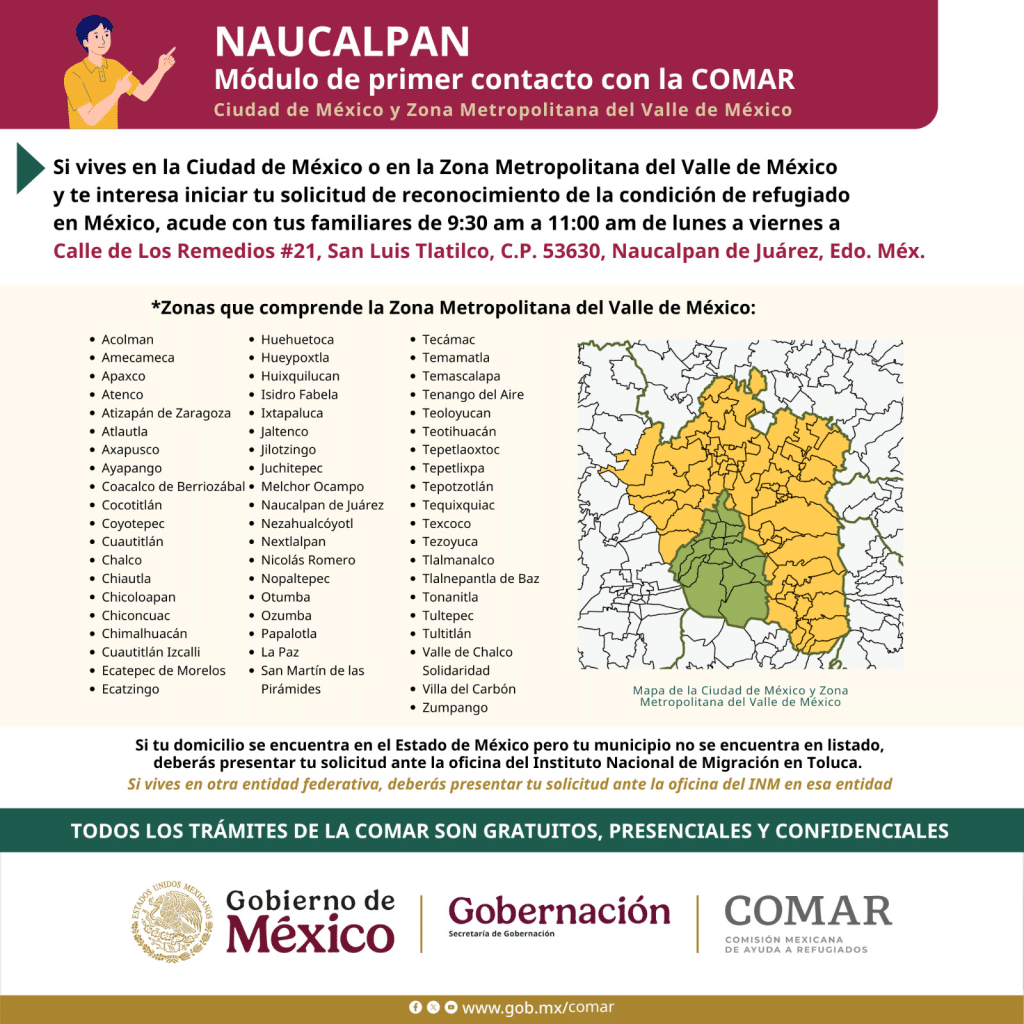 Recuerda que el primer acercamiento para solicitar refugio es en la oficina en Naucalpan, Estado de México si te encuentras en la capital del país o en la Zona Metropolitana.