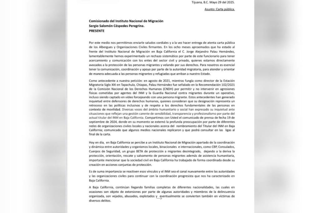 Albergues y colectivos dedicados a la atención migrante piden la destitución de Jorge Alejandro Palau, titular del INM en Baja California, por negligencia institucional y antecedentes documentados.