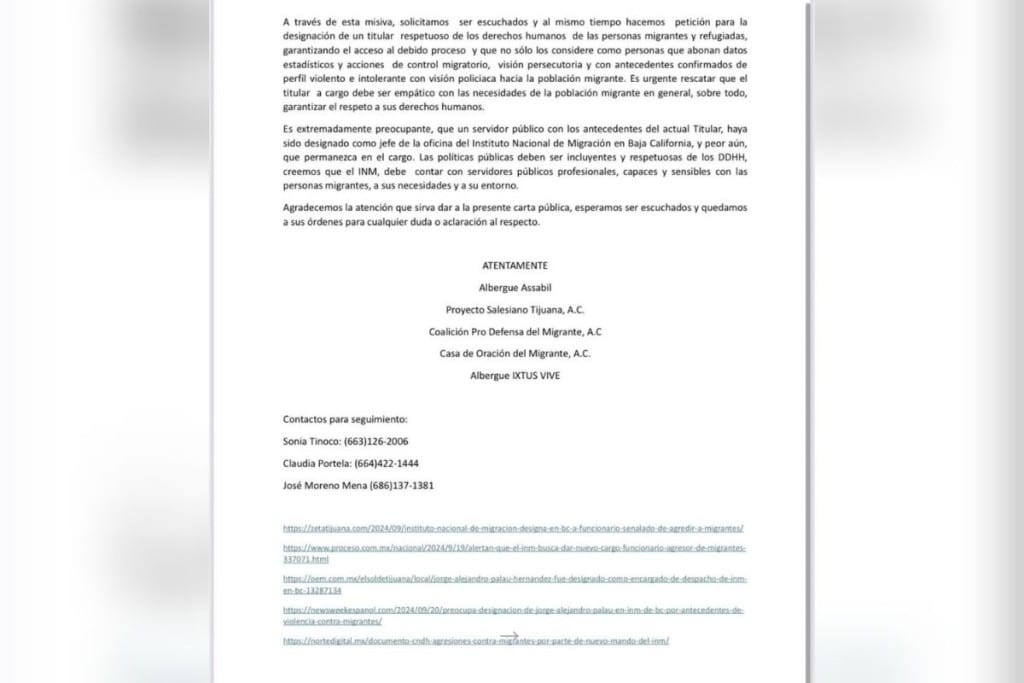 “Es urgente rescatar que el titular a cargo debe ser empático con las necesidades de la población migrante en general”, comentaron en la carta publicada.