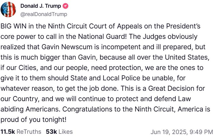“Esta es una gran decisión para nuestro país, y continuaremos protegiendo y defendiendo a los estadounidenses respetuosos de la ley. ¡Felicitaciones al Noveno Circuito! ¡Estados Unidos está orgulloso de ustedes esta noche!”, escribió Trump.