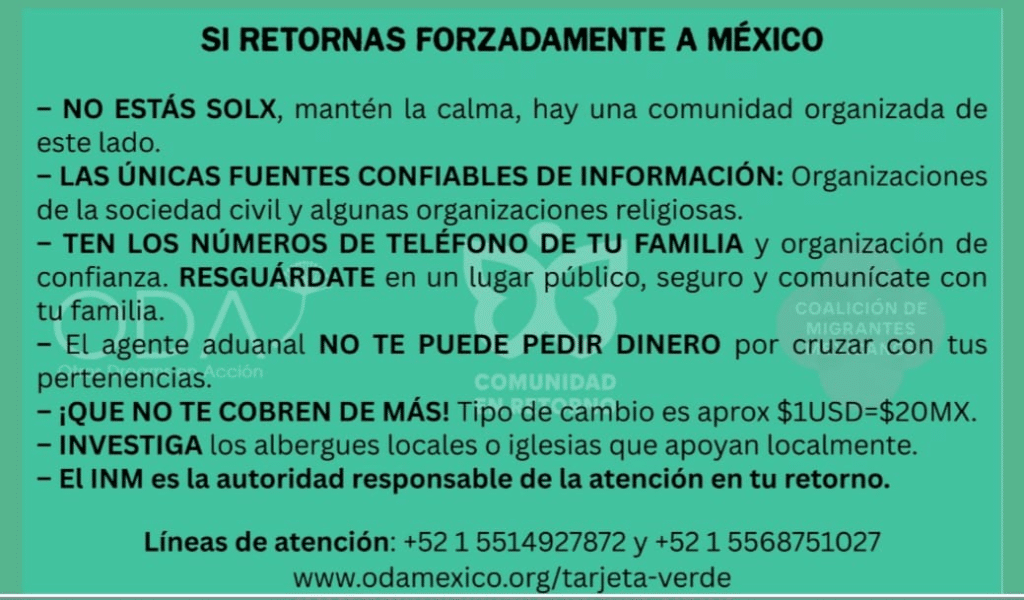La tarjeta fue creada por la organización Otros Dreams en Acción (ODA), junto con Comunidad en Retorno y la Coalición de Migrantes Mexicanos, con un solo objetivo: que sepas qué hacer si acabas de ser deportado.