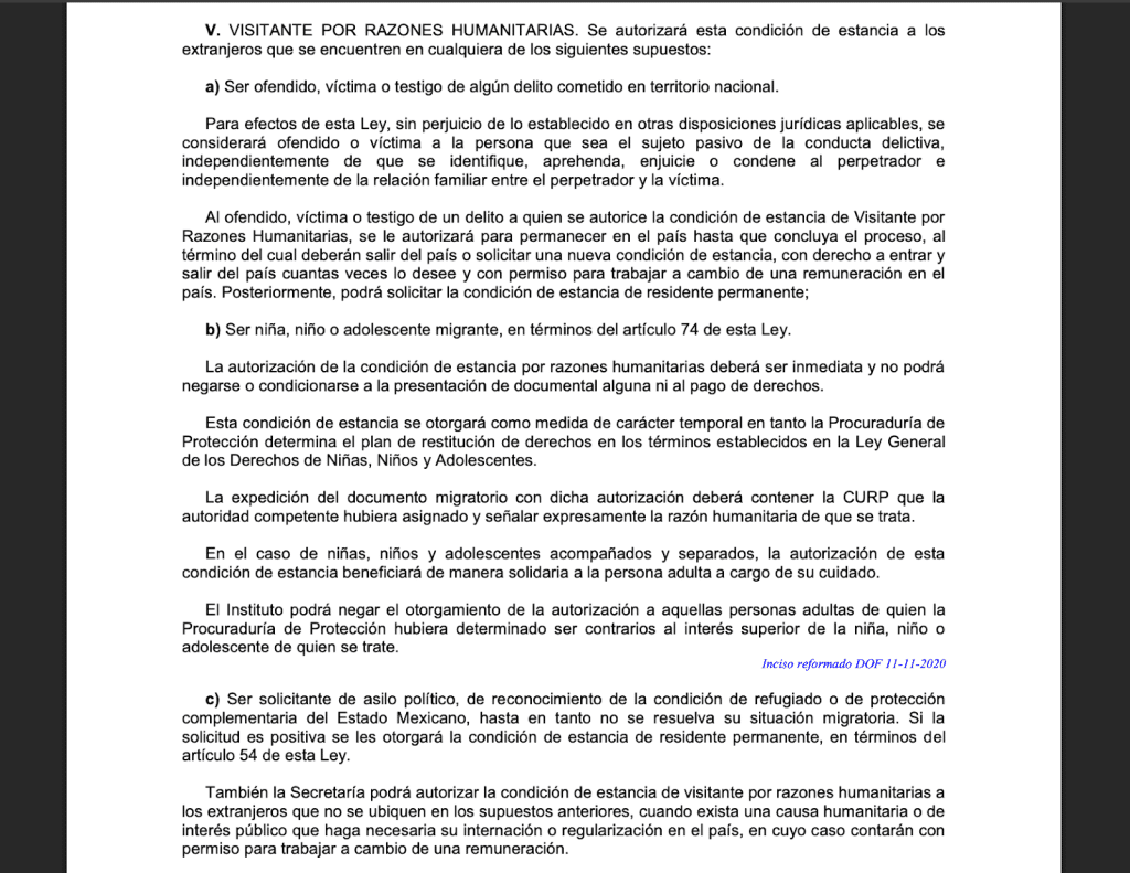 La TVRH es un documento emitido por el INM que permite acceder a empleo, servicios públicos de salud, educación y documentos de identidad, como una Clave Única de Registro de Población (CURP). Es un derecho contemplado en la Ley de Migración (art. 52. V), aprobada y promulgada en 2011. Y hasta ahora su expedición nunca ha sido derogada.