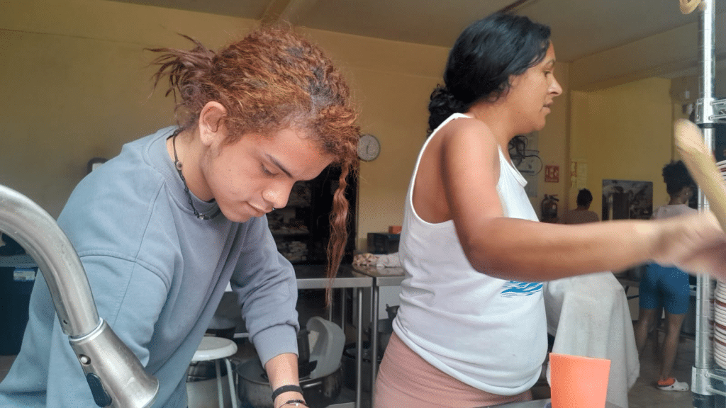 Marilde, con la cuchara en mano, remueve la comida desde temprano. Su mente regresa a 2019, cuando salió de Venezuela junto a sus hijas Marilyer y Marise, y su nieta. El camino fue duro. La ruta migratoria es algo que jamás repetiría, deja huellas físicas y emocionales, dice.