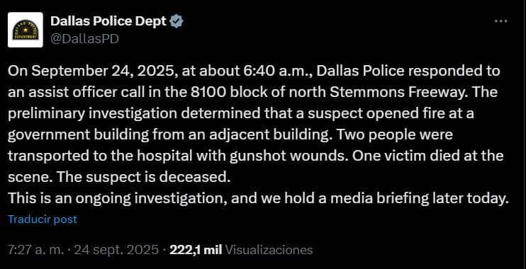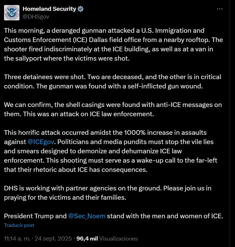 A través de sus redes sociales, la titular del DHS, Kristi Noem dio a las 7 de la mañana, hora del centro, información preliminar del tiroteo en las oficinas de ICE en Dallas. De estos datos destaca que: el tirador murió por una herida de bala autoinfligida y que se desconocen las causas que motivaron al agresor, del que tampoco se ha dicho nada sobre su identidad.