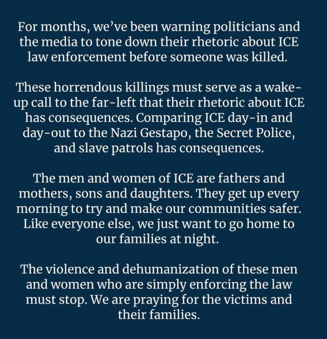 “Durante meses, hemos estado advirtiendo a políticos y medios de comunicación que moderen su discurso sobre las fuerzas del orden del ICE antes de que alguien sea asesinado”.