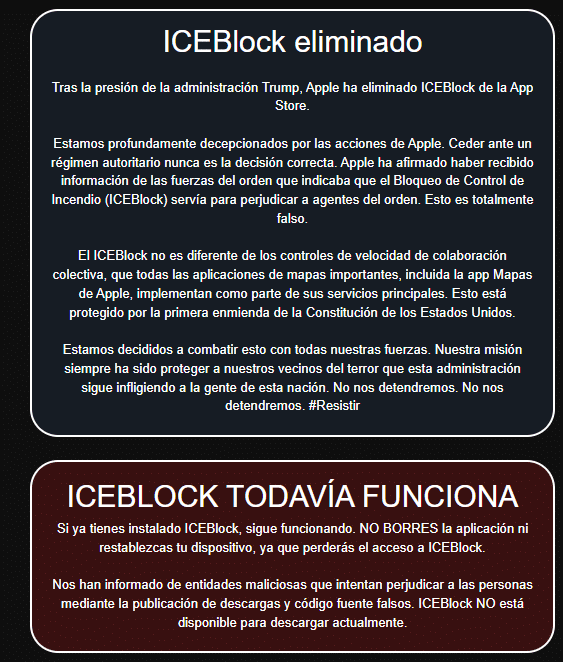 Sin embargo, en la página de ICE block, hay un anuncio que informa que si ya tienes instalada la aplicaciónaún sirve, no la borres ni la reestablezcas, pues perderás el acceso.