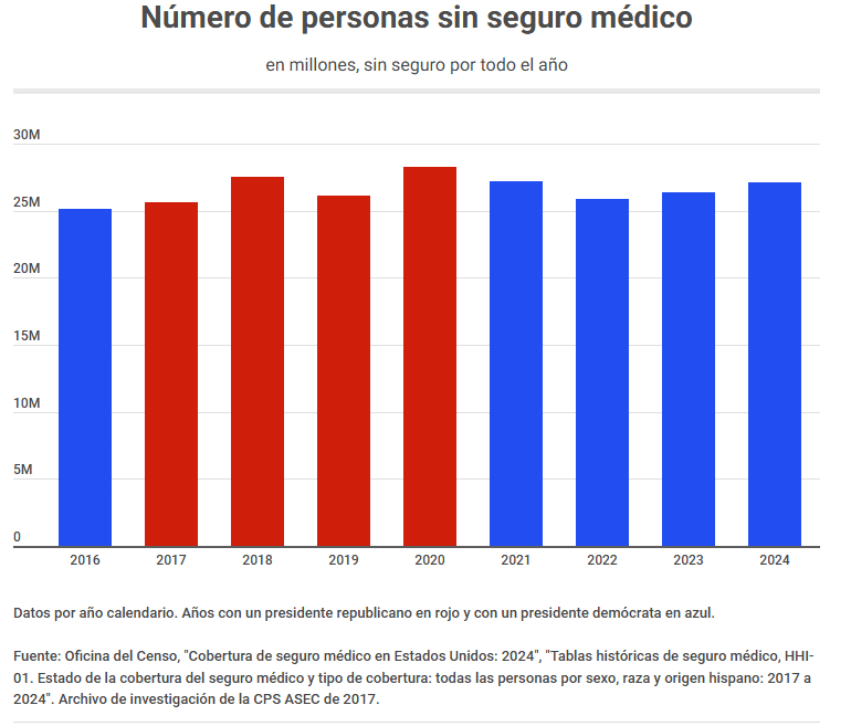 El NHIS, un proyecto del Centro Nacional de Estadísticas de Salud de los Centros para el Control y la Prevención de Enfermedades, halló que el 8,2 % de la población, o 27,2 millones de personas, carecía de seguro médico en 2024, según sus estimaciones preliminares publicadas en junio. El último informe de la Oficina del Censo, publicado en septiembre, situó la tasa de personas sin seguro en un 8 %.