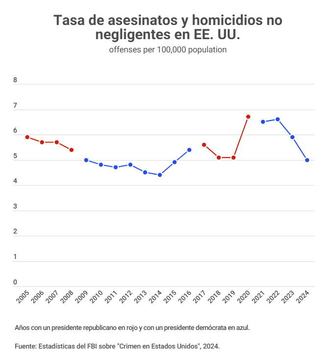 Un análisis realizado en enero por el Consejo de Justicia Penal (CCJ, por sus siglas en inglés) sobre los delitos denunciados en 40 ciudades estadounidenses hasta diciembre de 2024 reveló que la mayoría de los delitos violentos se encuentran en niveles iguales o inferiores a los observados en 2019, el año anterior al inicio de la pandemia del COVID-19 y las protestas por la justicia racial de 2020, cuando los delitos violentos aumentaron. El informe del CCJ reveló que las tasas de homicidio, agresión sexual, violencia doméstica y robo en 2024 fueron inferiores a las de 2019. Las tasas de agresión con agravantes, agresión con arma de fuego y robo de vehículos disminuyeron con respecto a las de 2020, pero aún eran superiores a las de 2019.