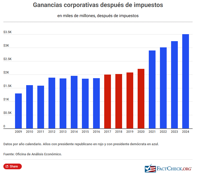 Los registros de la Oficina de Análisis Económico muestran (línea 45) que las ganancias corporativas aumentaron a aproximadamente 2,9 billones de dólares en 2021, a 3 billones de dólares en 2022, a 3,2 billones de dólares en 2023 y a aproximadamente 3,5 billones de dólares en 2024.