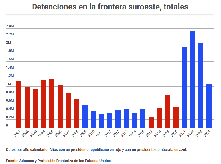 Pero esa instantánea subestima el aumento de la inmigración ilegal durante los cuatro años de mandato de Biden, porque las detenciones cayeron drásticamente en la segunda mitad de 2024, después de que Biden iniciara algunas políticas de emergencia para frenar los cruces fronterizos ilegales.