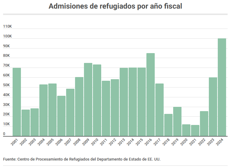 El número de refugiados admitidos en Estados Unidos aumentó drásticamente durante la administración Biden, en comparación con los cuatro años anteriores de la presidencia de Trump. Sin embargo, Biden nunca cumplió su ambiciosa promesa de campaña de aceptar hasta 125.000 refugiados al año.