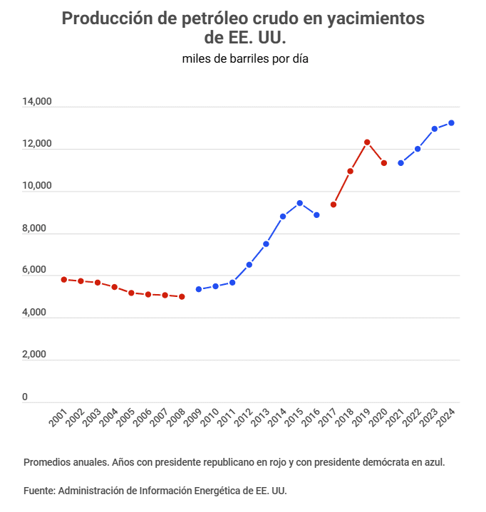 Contrariamente a las afirmaciones de republicanos que decían que Biden estaba obstaculizando la producción energética nacional, la producción de petróleo crudo se aceleró hasta alcanzar nuevos máximos durante su presidencia.