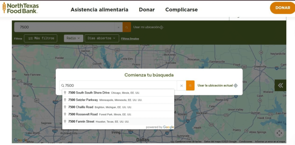 El North Texas Food Bank tiene un buscador de bancos en línea, solo escribe tu código postal y encuentra la despensa más cercana a tu casa.