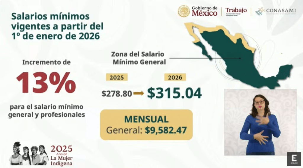 El salario mínimo general pasará a 315.04 pesos diarios, equivalentes a 9,582.47 pesos mensuales. En la Zona Libre de la Frontera Norte, el aumento será del 5%, para quedar en 440.87 pesos diarios, es decir, 13,409.80 pesos al mes.