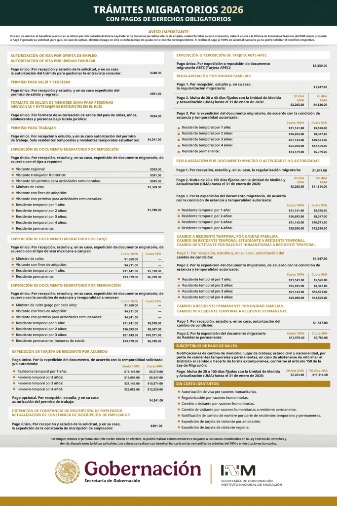 Desde el 1 de enero de 2026, México aplica nuevas tarifas oficiales para trámites migratorios ante el Instituto Nacional de Migración (INM). En la práctica, esto significa algo muy concreto: regularizar tu estatus, renovar tu residencia o pagar retrasos ahora cuesta más.