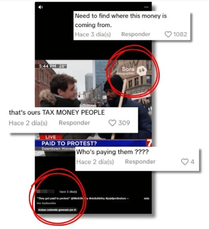En los últimos días se han viralizado varios contenidos creados con IA que supuestamente muestran a los manifestantes que han salido a las calles para denunciar las acciones de ICE. Por ejemplo, un video con más de 132,000 visualizaciones en TikTok muestra a un manifestante que asegura a un periodista que le pagan 20 dólares la hora para ir a las protestas contra ICE en Minnesota. “Necesitamos averiguar de dónde viene el dinero”, “¿quién les está pagando?” y “ese es nuestro dinero de los impuestos” son algunos de los comentarios que podemos encontrar en la publicación original.