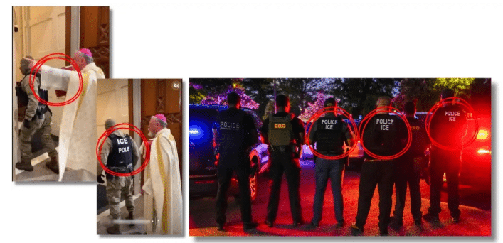 “Tu trabajo se detiene en estas puertas, quien busque refugio aquí lo encontrará”. Pero tampoco es real: ha sido creado con IA, algo que revelan indicios como la Biblia que parece sostenerse por sí sola cuando el religioso estira el brazo y el uniforme de uno de los agentes en el que se lee “ICE POLE” en lugar de “POLICE ICE” (como dicen los uniformes oficiales del organismo).
