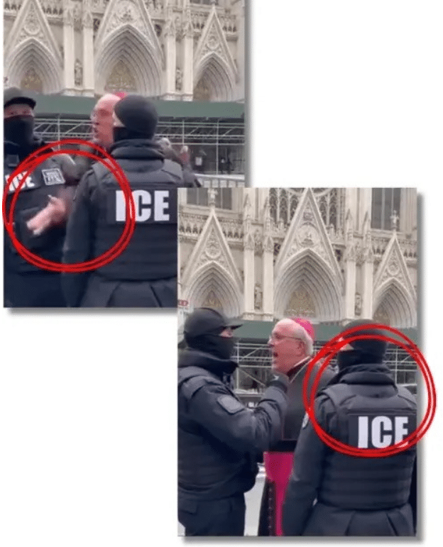 Este mismo fallo en los uniformes de los agentes se repite en otro video creado con IA de este tipo: en él un obispo católico discute con agentes de ICE fuera de una catedral para evitar que detengan a sus fieles inmigrantes. El video no es real, ya que no hay registros del incidente en medios a 13 de enero de 2026, y el contenido muestra diversos indicios de haber sido creado con IA. Por ejemplo, la imagen parpadea, la mano del obispo se alarga, un coche aparece de la nada en el fondo o los errores en la vestimenta que hemos comentado. A esto se suma que, en algunas publicaciones, se identifica al supuesto obispo como “Blake Cupich” de Chicago: sí existe un sacerdote en esa ciudad de nombre Blase Cupich (no “Blake”), pero su apariencia no coincide con la del hombre del video.