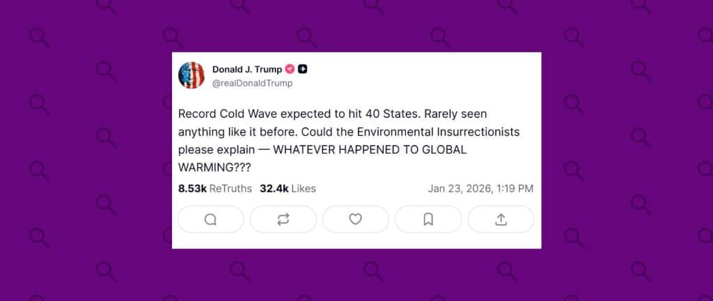 “Se espera que una ola de frío récord afecte a 40 estados. Rara vez se ha visto algo así antes. ¿Podrían los insurreccionistas medioambientales explicar qué paso con el calentamiento global?”, indicó el presidente Donald Trump en una publicación en su red social Truth Social el 23 de enero de 2026. Pero el hecho de que haya una ola de frío extrema no desacredita el calentamiento global, según varios expertos.