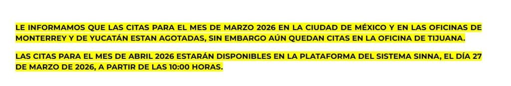En cuanto al día debes estar muy atento, ya que el portal de la SRE te informa el día y hora que se abren las citas (clic aquí para consultar) en el Sistema SINNA, sin embargo, el número de espacios es limitado y pueden agotarse rápidamente.