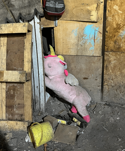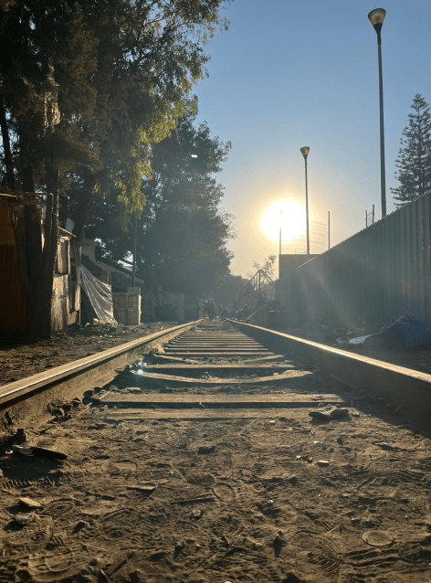 El campamento se extiende en línea recta sobre la vía muerta. Entre las piedras y la tierra hay juguetes esparcidos: legos incompletos, triciclos, peluches que alguien dejó caer.