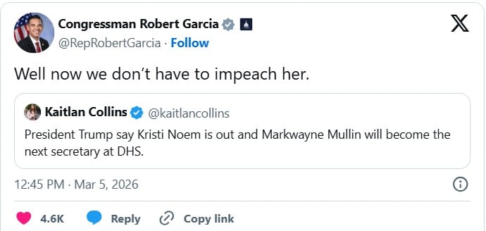 En su cuenta personal, el demócrata publicó un video con la leyenda “En memoria de Kristo Noem” y la descripción “Se fue, pero no se olvida”.