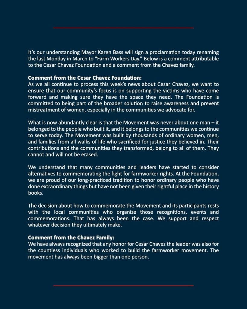 En tanto, durante la mañana de este viernes, la Cesar Chavez Foundation habló sobre el cambio del nombre del último lunes de marzo al “Día de los Trabajadores Agrícolas”. A través de un breve comunicado, la fundación dijo estar “comprometida a ser parte de la solución integral” del problema y prevenir el maltrato a las mujeres, “especialmente en las comunidades a las que representamos”.