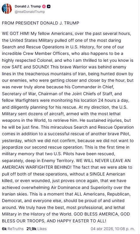 Además, el propio Trump estuvo sumamente activo en su red Truth Social, lanzando advertencias agresivas sobre la inmigración, un ultimátum bélico hacia Irán y al rededor de las 10 de la noche, confirmó el rescate de uno de los pilotos cuya aeronave fue derribada en Irán.