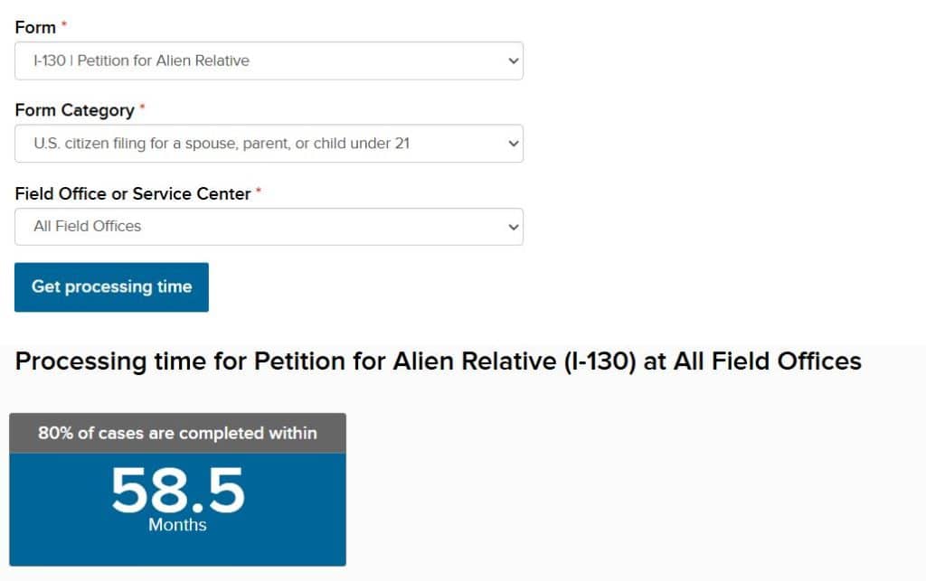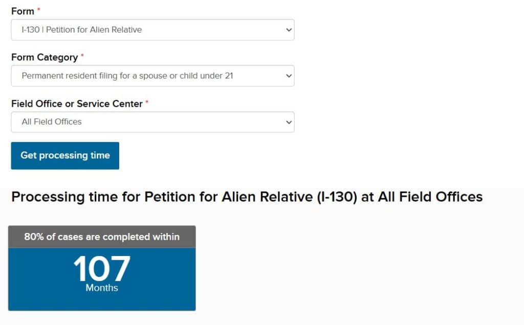 Sin embargo, estos periodos pueden ser mayores, pues recientemente especialistas han denunciado retrasos en los procesos realizados por USCIS. De acuerdo con el estimador de USCIS el tiempo promedio de solicitudes de este tipo se resuelven en 58 semanas y media para ciudadanos y 107 meses para residentes.