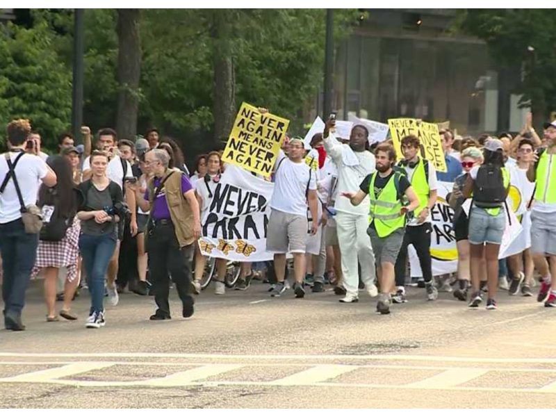 Los organizadores eran activistas judíos que iban por la calle cantando y gritando "los migrantes son bienvenidos aquí", mientras tocaban tambores.